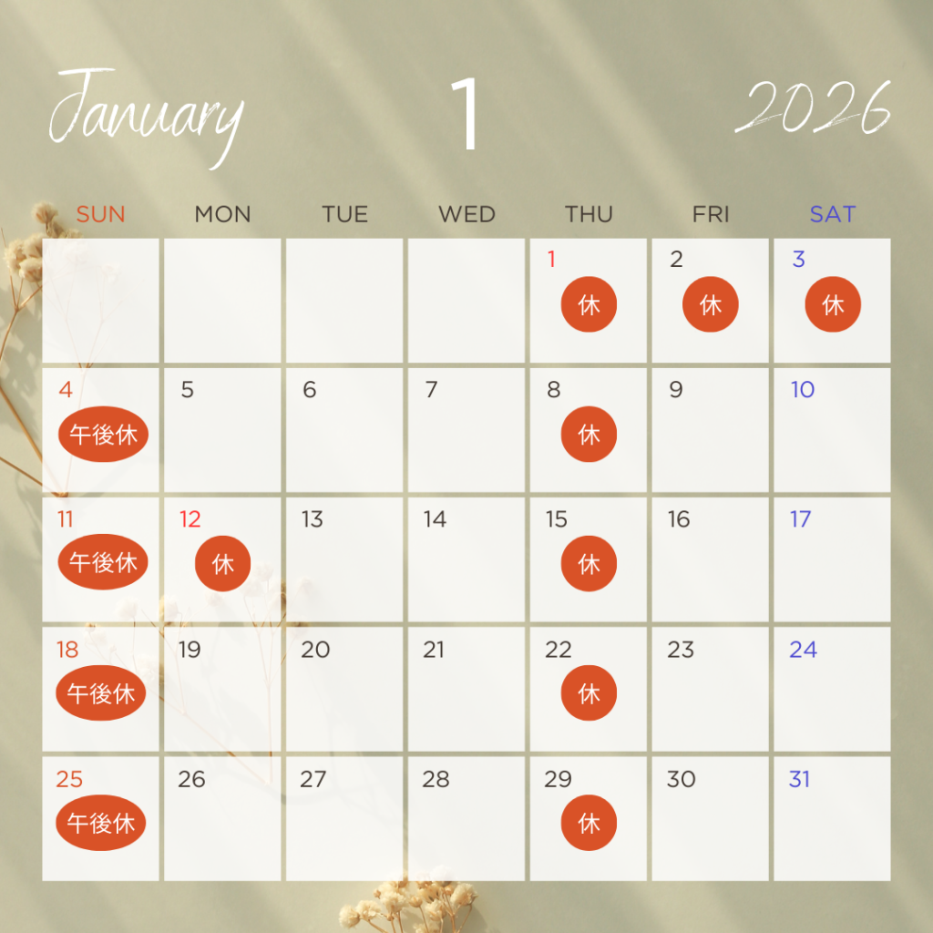 2026年1月の休診日カレンダーになります。年始は1/1(木)〜1/4(日)まで休診となります。1/5(月)から通常通りの診察となります。1/12(月)は祝日で休診となりますのでご注意ください。