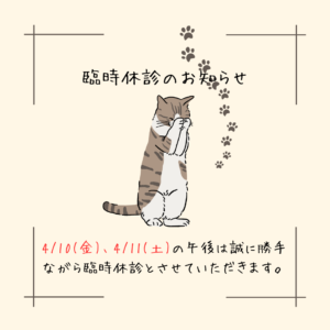 3/22(日)午前と3/23(月)午前は、副院長が都合のため不在となります。混み合うことが予想されますので、あらかじめご確認の上、ご来院いただくようお願いいたします。皆様には大変ご迷惑をおかけしますが、何卒よろしくお願いいたします。